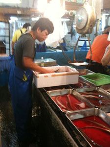 深夜?早朝?AM1時前に築地に出勤し、注文を確認して入荷した穴子をチェックします。